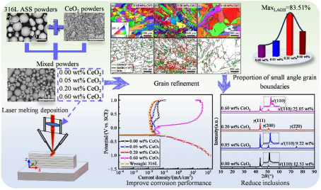该研究针对燃料电池(PEMFCs)双极板的性能需求,系统探究了通过LMD工艺制备的316L不锈钢中引入不同含量氧化铈(CeO2)纳米颗粒对其显微组织演化与钝化膜稳定性的影响。研究结果表明,当CeO2添加量为0.20 wt%时,材料的耐蚀性能最优。此时,晶粒显著细化,低角度晶界与ΣCSL晶界比例提高,位错密度增加,有利于形成致密、缺陷少的钝化膜,从而显著提高合金的抗腐蚀能力。