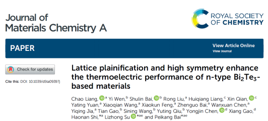 近日,我院作为第一完成单位的研究论文“Lattice plainification and high symmetry enhance the thermoelectric performance of n-type Bi2Te3-based materials” 在材料领域国际知名期刊《Journal of Materials Chemistry A》正式接收并在线发表。我院博士研究生梁超为第一作者,宿力中教授、白培康教授与石浩男教授担任共同通讯作者。
