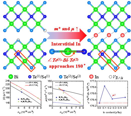 该研究采用了Se合金化和间隙性In共掺杂的方法,协同优化载流子迁移率(μ)与态密度有效质量(m*)。1、固溶Se在提升载流子浓度(nH)的同时降低了晶格热导率(κlat);2、间隙In的引入抑制了阴离子空位的形成,同时改变了局部键角Te(1)-Bi-Te(2)的大小,提高了局部晶格对称性,解释载流子迁移率(μ)的提升;3、间隙In的引入引发共振能级,提升了态密度有效质量(m*)。在300-373K范围内ZTave约为1.1。此外,搭建了基于n型Bi2Te3的单腿器件,在225K的温差下,其单臂热电器件实现5.3%的发电效率。
