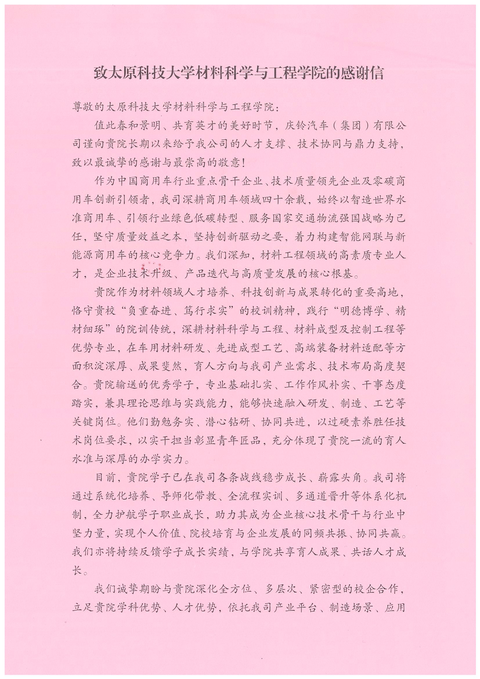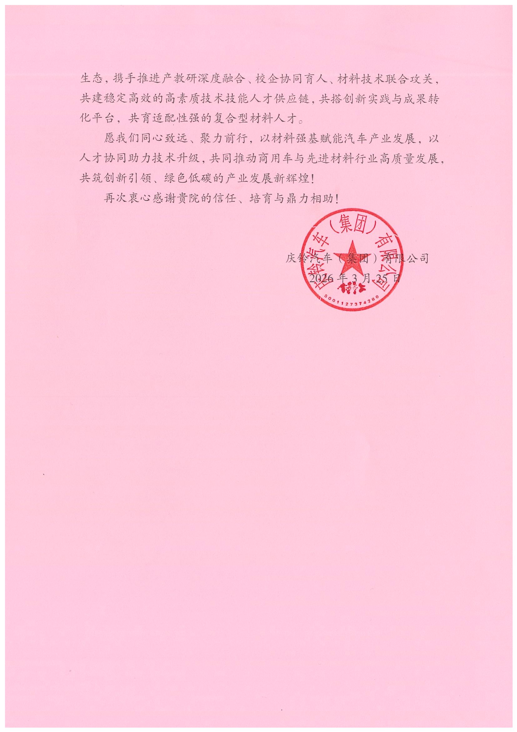 感谢信中提到,我院毕业生在庆铃集团工作期间,展现出扎实的专业功底、严谨的工作态度和出色的实践能力,迅速成长为各自岗位上的骨干力量,为企业高质量发展注入了新鲜活力。信中指出,学院坚持“负重奋进、笃行求实”的校训精神,践行“明德博学、精材细琢”的院训传统,培养的学子专业基础扎实、工作作风朴实、干事态度踏实,与企业发展需求高度契合,期待双方进一步深化校企合作,共同探索协同育人新路径。