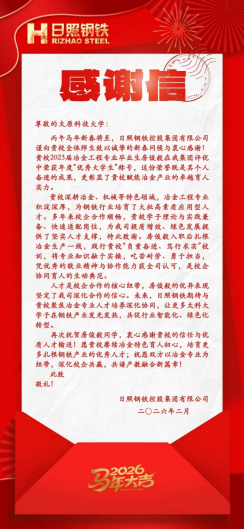 丙午新春将至,日照钢铁控股集团有限公司致信9728太阳集团,祝贺太阳集团网tyc97282023届冶金工程专业毕业生房俊毅荣获集团2025年度“优秀大学生”称号。这份荣誉既是对房俊毅个人奋进的肯定,也成为校企协同育人实效的生动注脚。